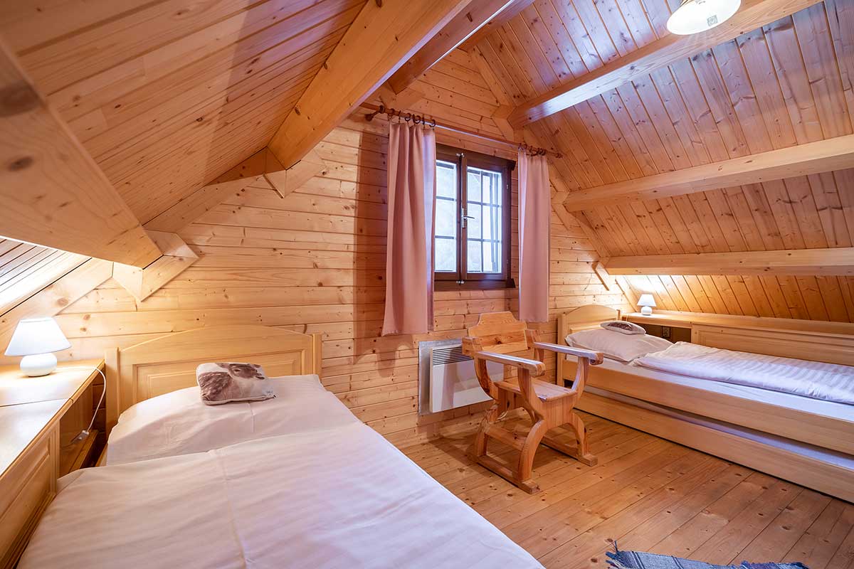 Chata Medveď je až pre 12 osôb, má 3 spálne, 2 kúpelne, veľkú obývačku spojenú s otvorenu kuchyňou a jedálenským priestorom.